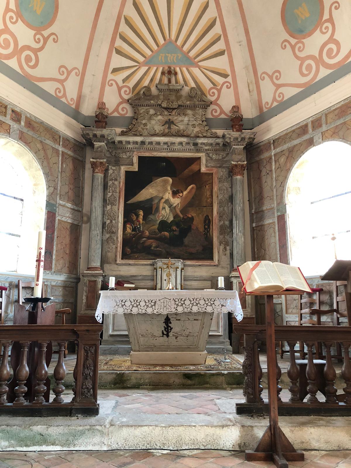 - La nef, percée de quelques baies étroites a conservé le caractère du roman tardif.
